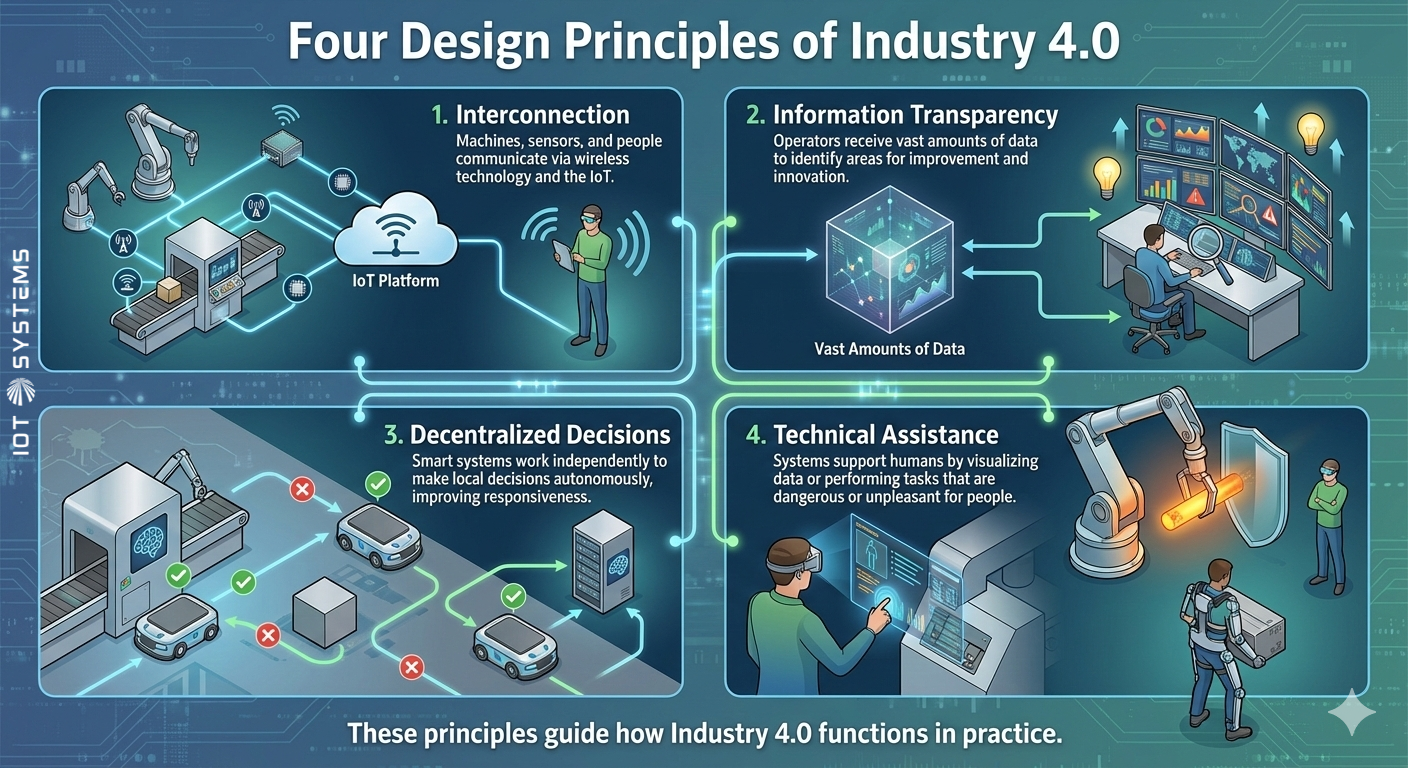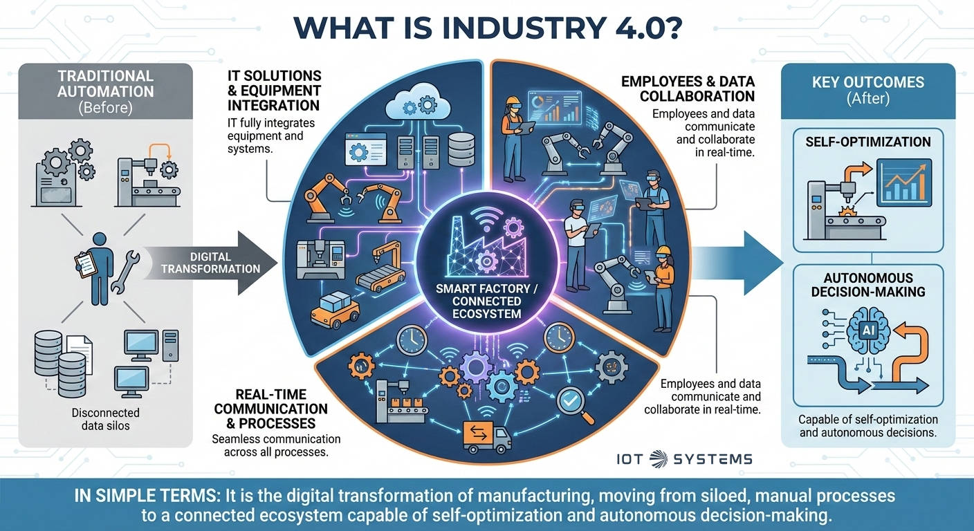 Industry 4.0 refers to the intelligent networking of production systems where information technology (IT) solutions fully integrate equipment, employees, and data. Unlike traditional automation, it focuses on creating smart factories where machines, people, and processes communicate and collaborate seamlessly in real-time.