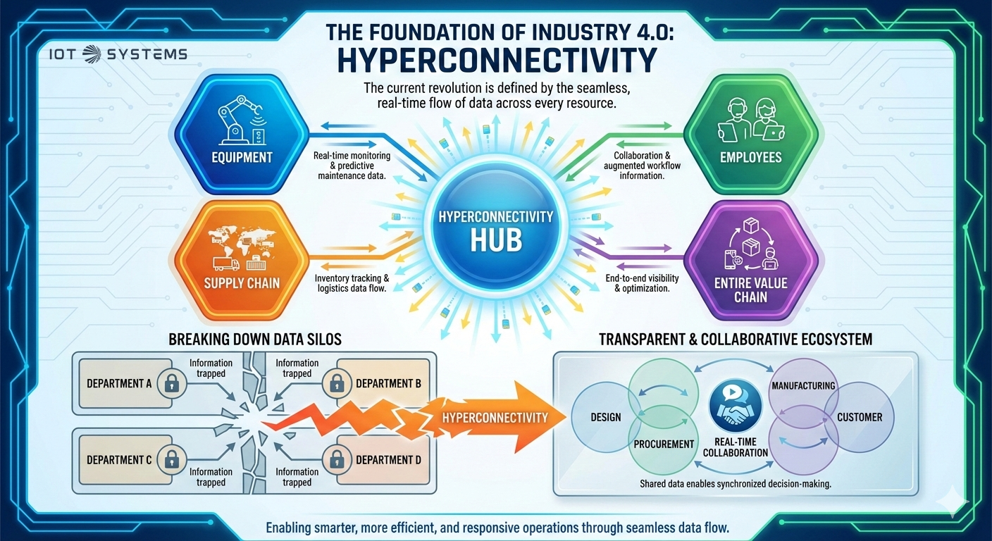 What truly sets the current revolution apart is hyperconnectivity. This is the smooth, real-time flow of data across every resource: equipment, employees, and the supply chain. By breaking down data silos where information is trapped in specific departments, hyperconnectivity allows data to flow smoothly across the entire value chain. This makes a company’s resources transparent, allowing for real-time collaboration between design, procurement, manufacturing, and the customer.