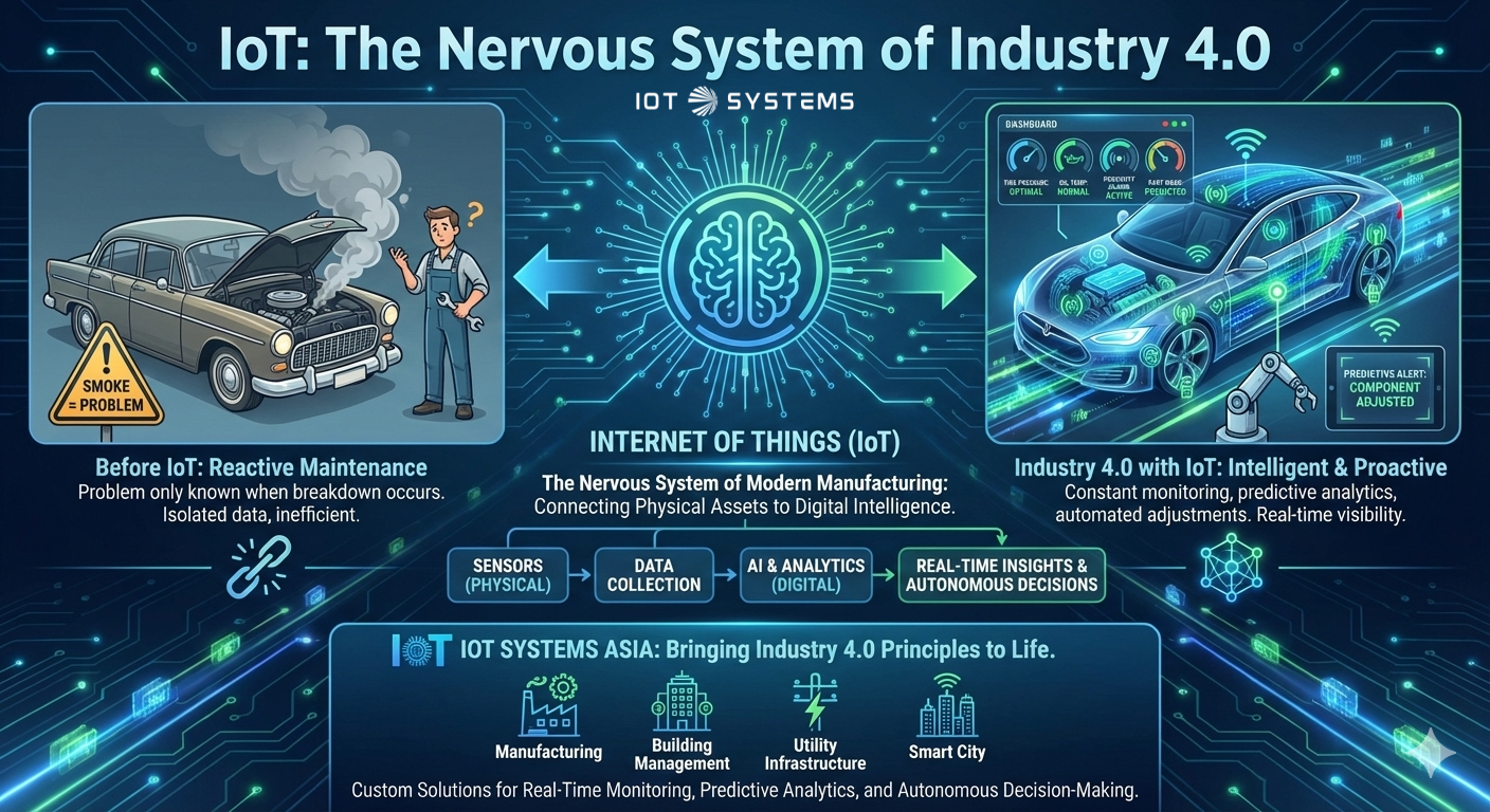 Imagine your factory as a high-end modern vehicle. In older cars, you only knew there was a problem when smoke came out of the engine. In a connected Industry 4.0 factory, the IoT sensors are like the car’s internal computer system that constantly monitors tire pressure, oil temperature, and proximity to other cars. It doesn’t just wait for a breakdown; it tells you exactly which part is wearing out and can even automatically adjust the braking or engine performance to keep you safe and efficient before you even notice a vibration in the steering wheel.