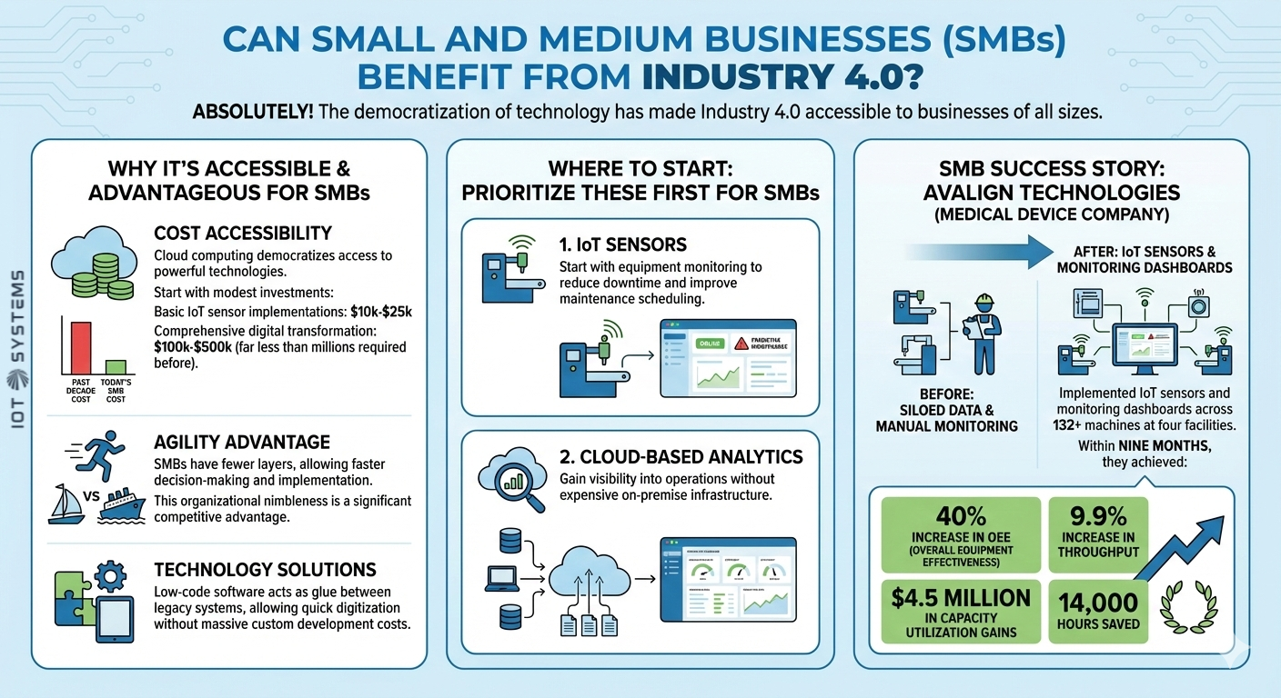 SMB Success Story: Avalign Technologies, a medical device company, implemented IoT sensors and monitoring dashboards across 132+ machines at four facilities. Within nine months, they achieved a 40% increase in Overall Equipment Effectiveness (OEE), 9.9% increase in throughput, $4.5 million in capacity utilization gains, and saved 14,000 hours.